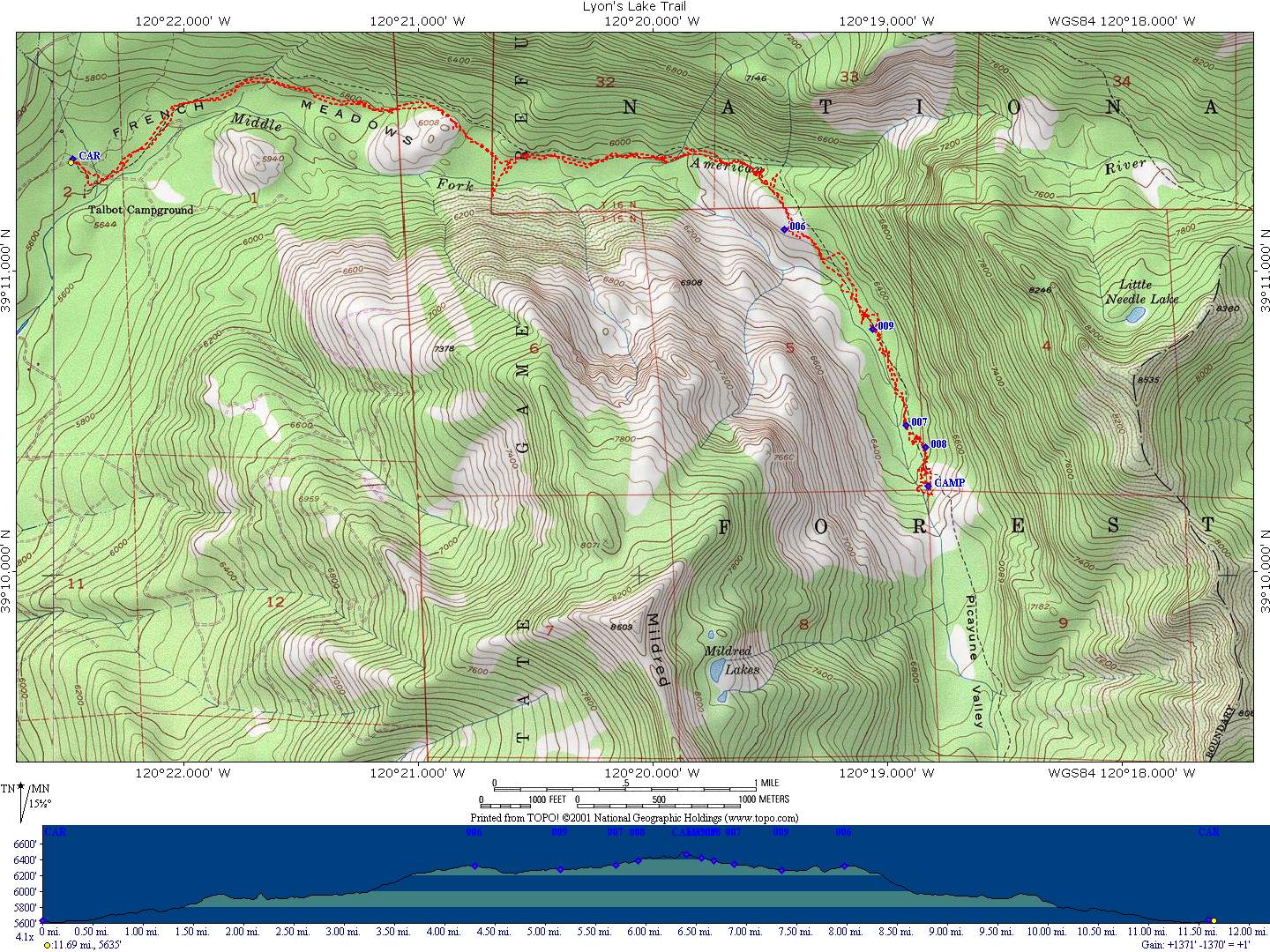 So here's the map of the route which we took, marked by our GPS unit and Topo!.